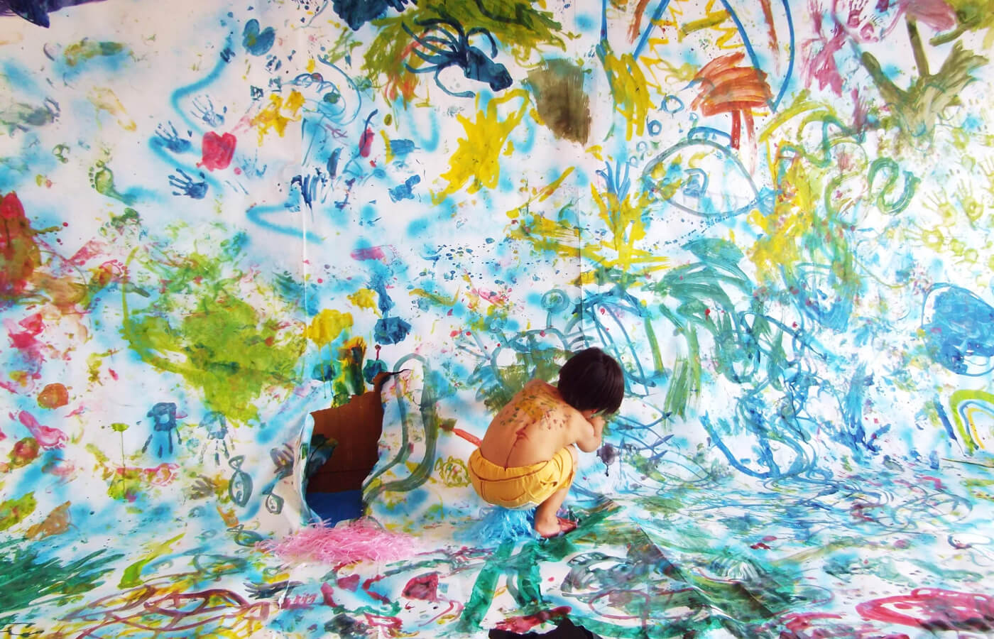 一緒に思い切りアートして、笑ったり、時に叫んだり、いろんな自分と出会って表現して子どもたちと共に味わう体験を提供しています。
