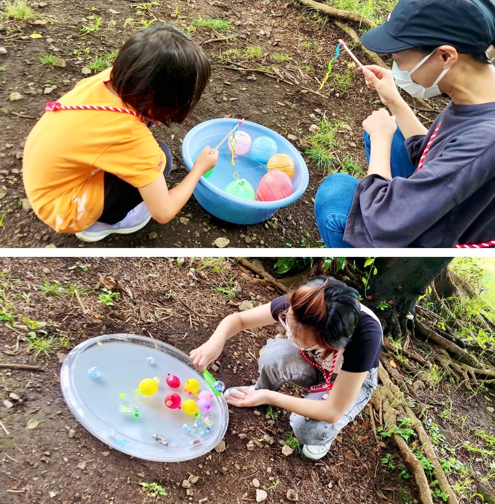 まずは「ヨーヨー釣り」や金魚すくいならぬ「画材すくい」でお祭り気分を思い出し、みんなで遊びました。