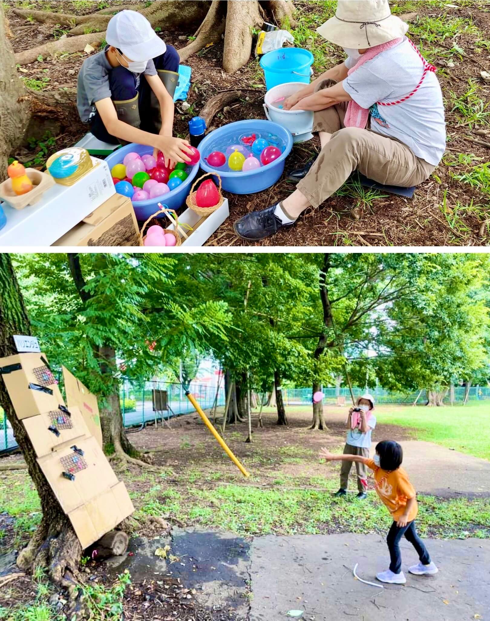 最後にみんなのアート作品のお話を聞きながら、作った楽器でセッションをして音色を楽しんだり、水風船的当てゲーム屋さんで大人も子どもも景品ゲットを目指して夢中になって何度も遊んで楽しみました。