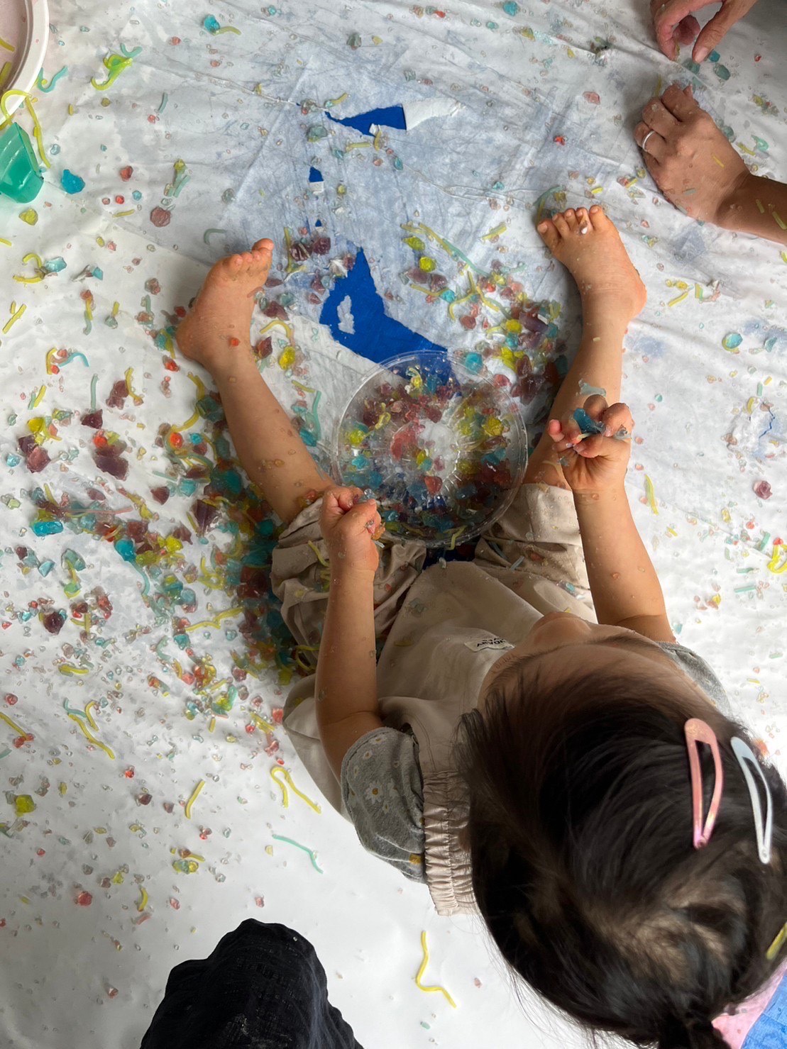 子ども達は、ほとんどが飽きることなく寒天の色や感触の世界にものすごい集中力で遊んでいたのが素晴らしかったです。