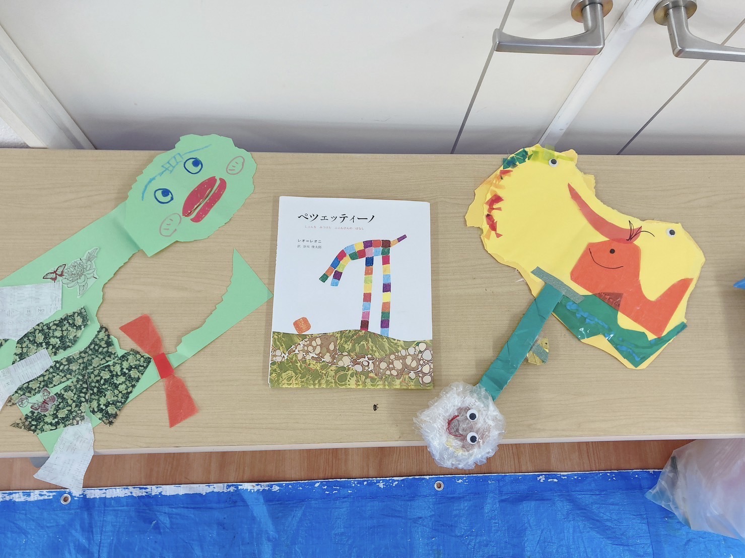 実際のワークでは、『ぺツェッティーノ』(レオ・レオニ著)という絵本を読んで、色画用紙やセロハンを使って世界一ユニークな友だちを作りました。