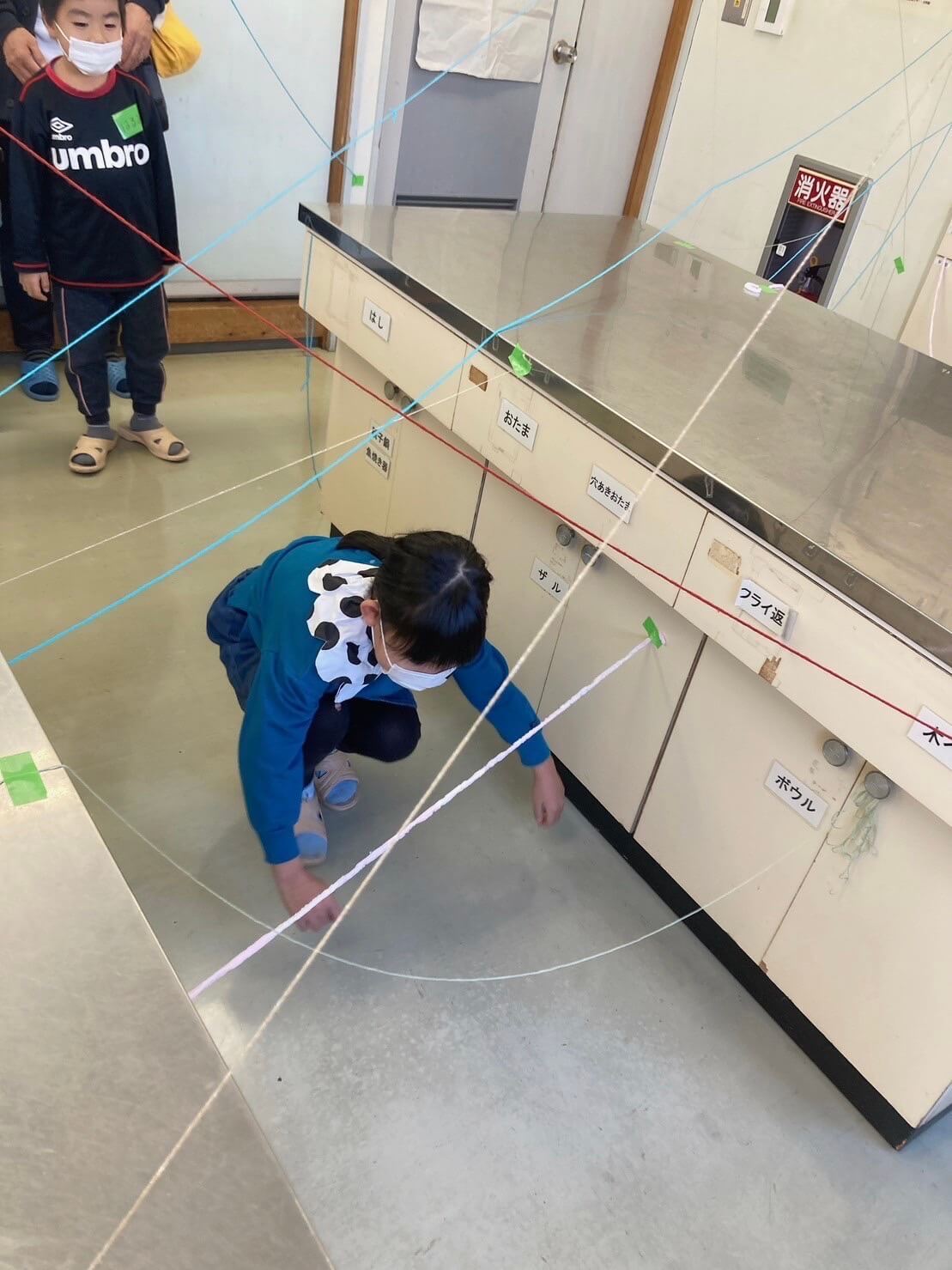 蜘蛛の巣のように毛糸が張り巡らされた通路からどこかに隠れている今日のワークのヒントを探すところからスタート。