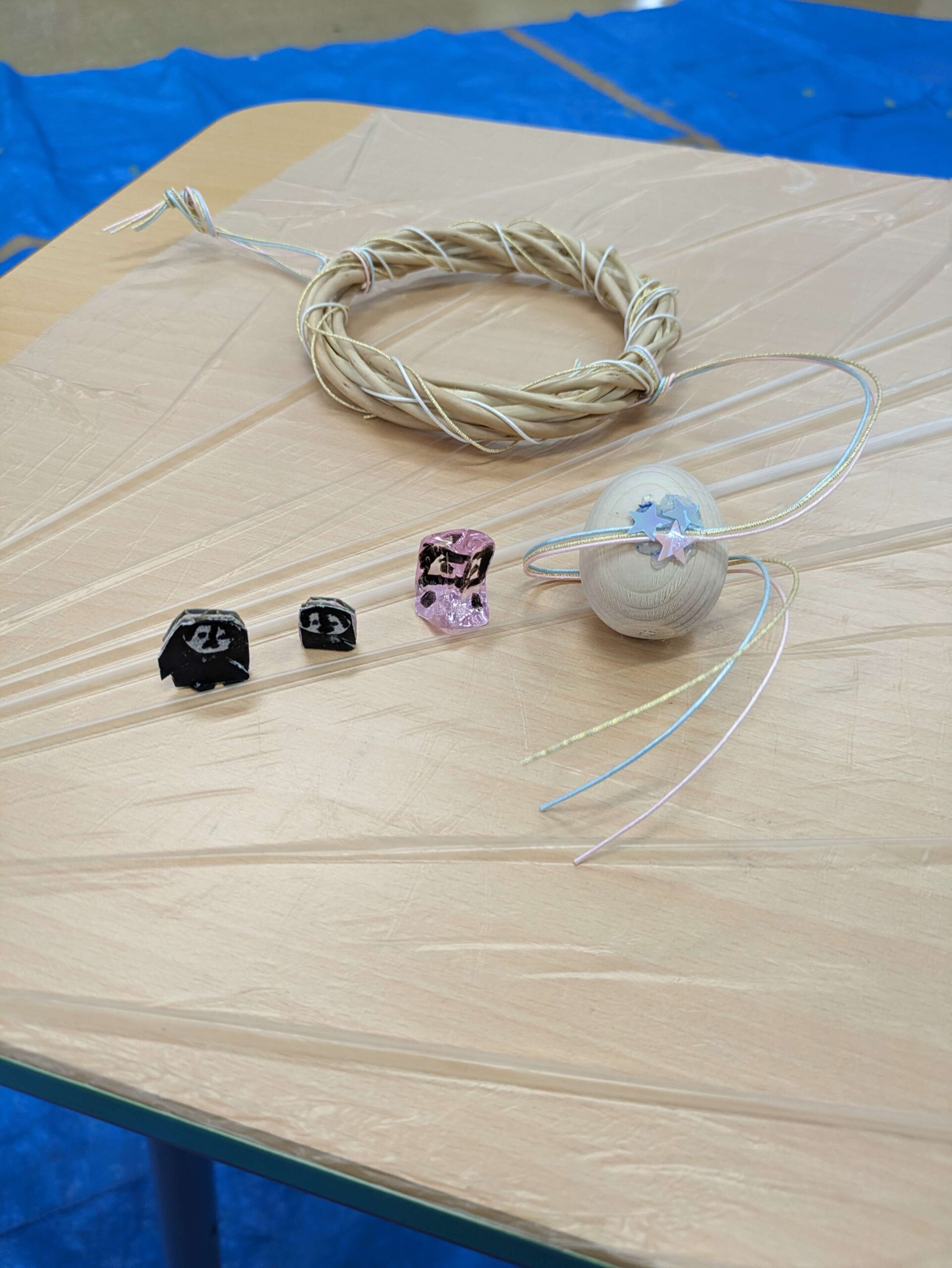 1月の素材には羽子板、絵馬、卵型をした木、布や切った段ボールなどを用意しました。