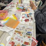 発散した後は、こづちから玩具やおやつなど色んな物が出てくるという絵本を読みました。絵本を読んだ後、「自分が嬉しいな、こんなのがあったらいいなと思うものがこづちから出てくるとしたらどんなのかな?素材を使ってアートしていこう。」というテーマでアートしていきました。