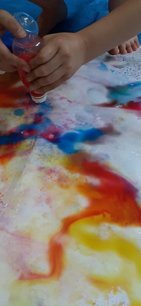 塗りたい色を慎重に選び丁寧に塗ることに心地よさを感じていたHくん。いつも1つ1つのことを選ぶのによく考え、丁寧で優しさを感じます。それはとっても素敵なHくんらしさです。でもこの日はセラピストが絵具をびゅーっと出して色を塗っているのを見たHくん。それを真似してやってみると「なにこれ!たのしい!」とすっかりそのやり方が気に入り、そのあとは自分で自分の表現をしていきました。どんな表現をする自分も大切な自分。その世界を一歩広げていたようでとても素敵でした。その子の心のエネルギーに触れるとき本当に私たちセラピストも満たされるようなうれしい気持ちになります。