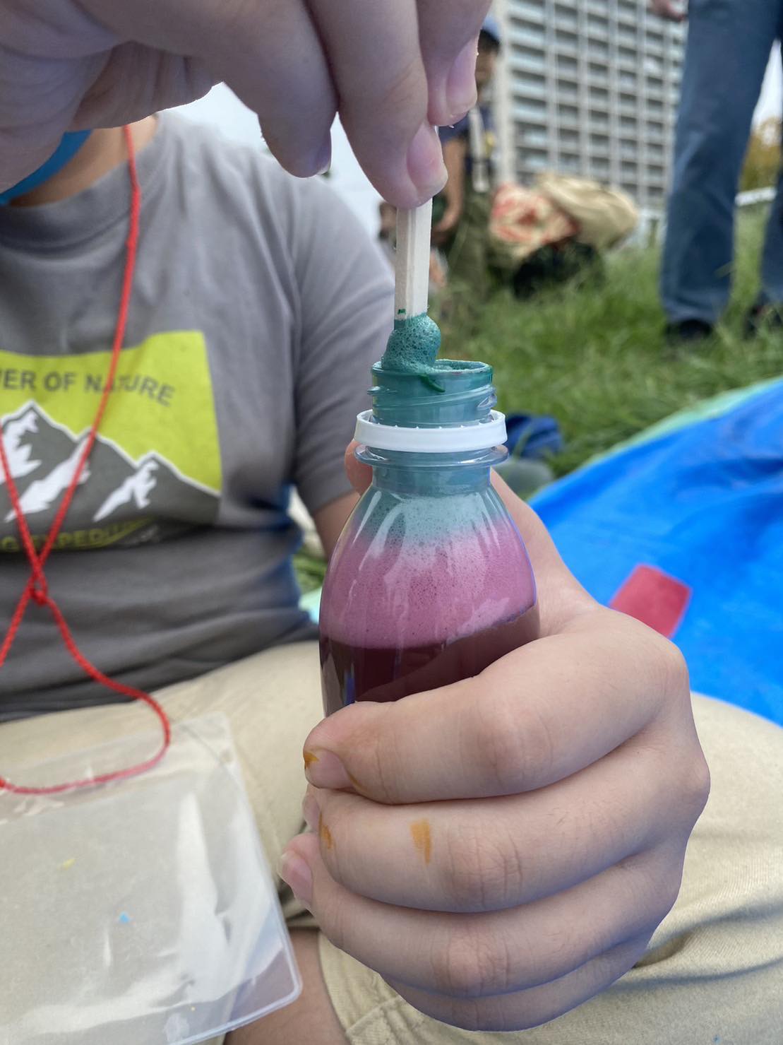 小さなペットボトルを1人1本渡して、その中に自分の好きな色を入れて色水を作りました。