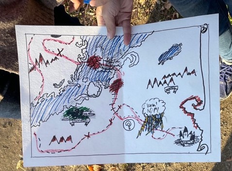 紅く染まる公園を探険隊になって五感をつかって宝探しをしたり、それを元に自分だけの宝の地図をつくりました。