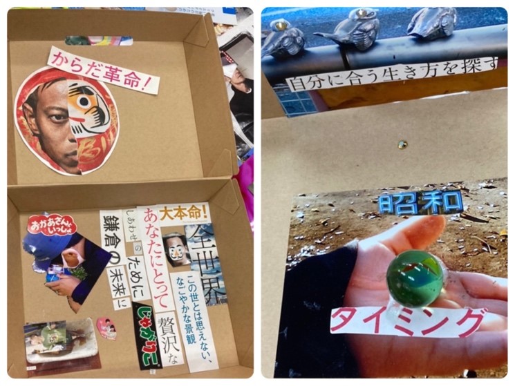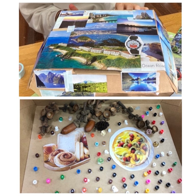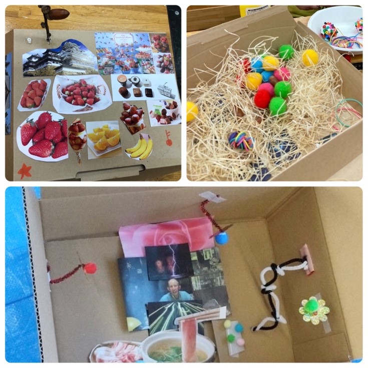 自分の撮った写真にハッとするような文字を組み合わせて哲学的な話をしてくれた子、自分の場所と世界中の行ってみたい場所の話をしてくれた子、箱にタイヤが付いていて不思議な場所を行き来する話をしてくれた子等々、みんな箱の内も外も使って思い思いの物語を紡いでいました。このそれぞれの物語を聞く時が本当に楽しくて大好き♡心に染み込んできます。
