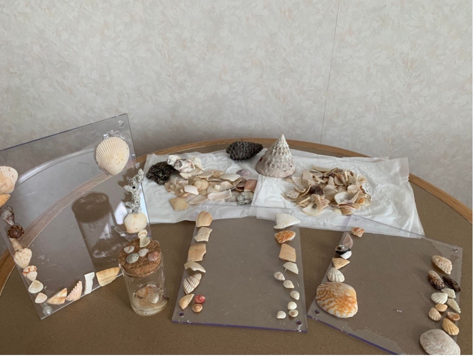 友達のことを想像しながら 海の恵みでARTしました。貝殻の写真立てと貝殻の瓶詰め。