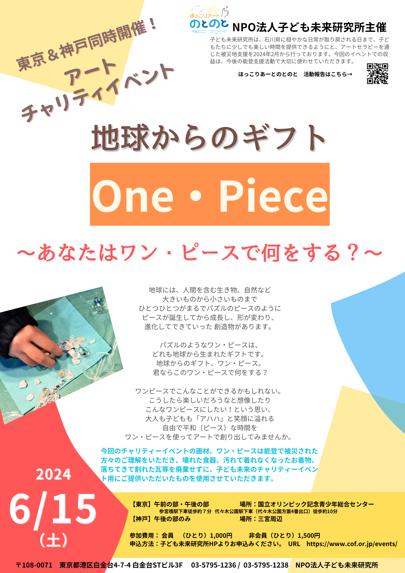 アートチャリティイベントを東京・神戸 投稿日時: 2024年5月18日 投稿者: higashiya 子ども未来研究所では、2024年6月15日(土)に、東京・神戸にて、石川県復興支援に伴うアートチャリティイベントを開催いたします。 子ども未来研究所は、石川県に穏やかな日常が取り戻される日まで、子どもたちに少しでも楽しい時間を提供できるようにと、アートセラピーを通じた被災地支援活動を2024年2月から行っております。今回のイベントでの収益は今後の能登支援活動で大切に使わせていただきます。是非この機会にご参加ください。 東京イベント 神戸イベント イベントフライヤー この記事が気に入ったらいいね ! しようシェアするツイートする