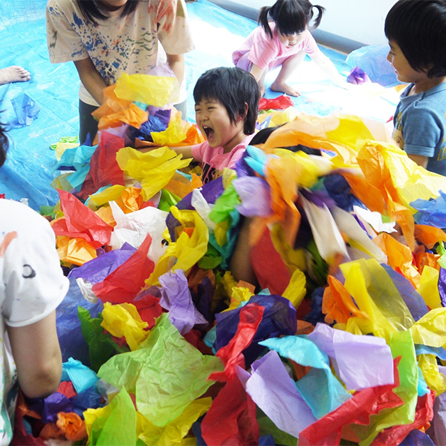 赤・白・黄・青、たくさんの色の中に飛び込んで思いきり遊びます!ひとしきり遊んだ後は…“あるモノ”を加えると全く違った感触に大変身!