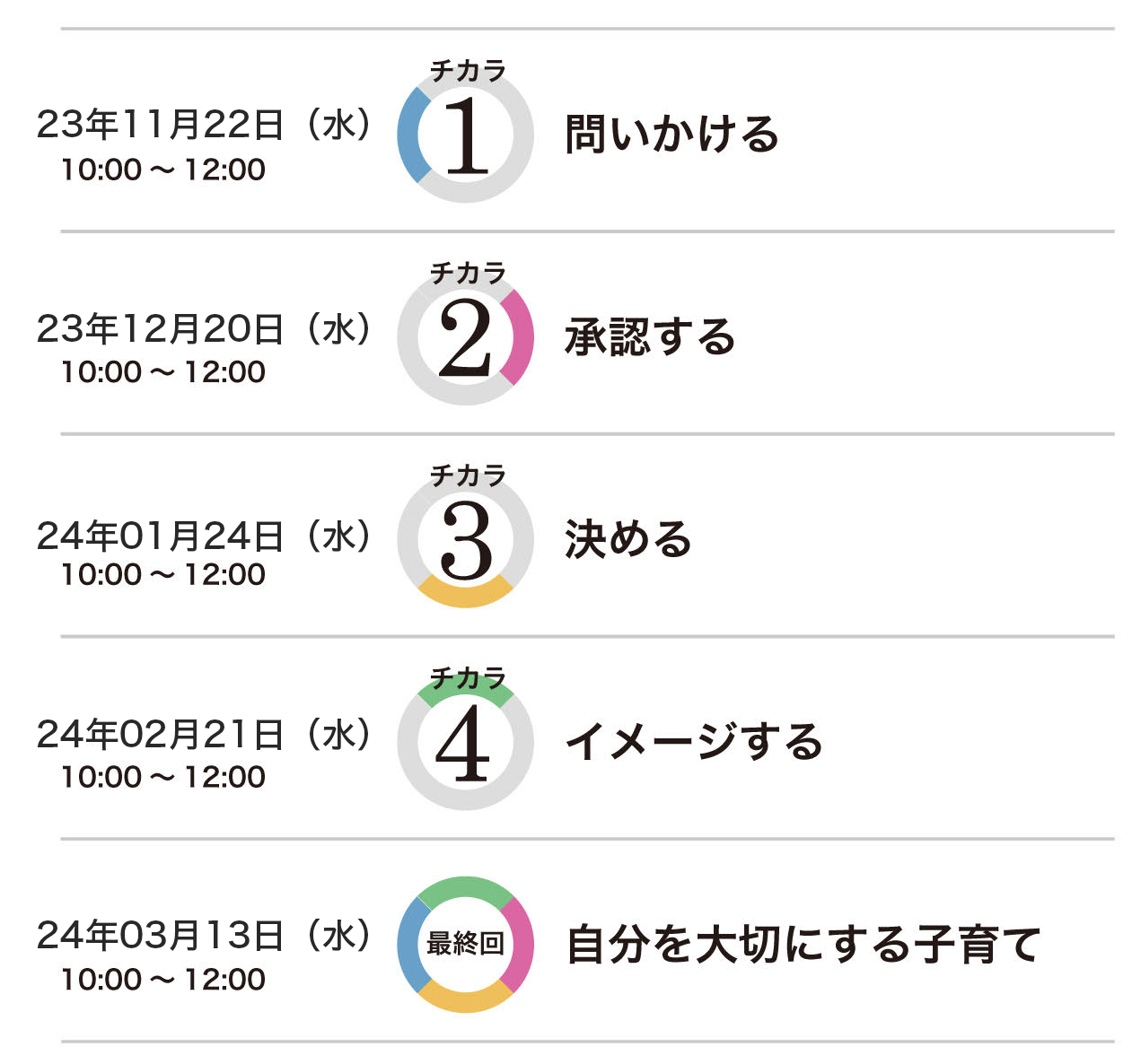 この講座は継続講座です。どの回からでも、何度でも受講して頂けます。 2023年11月22日(水)10:00〜12:00: 【問いかける】 2023年12月20日(水)10:00〜12:00: 【承認する】 2024年01月24日(水)10:00〜12:00: 【決める】 2024年02月21日(水)10:00〜12:00: 【イメージする】 2024年03月13日(水)10:00〜12:00: 【自分を大切にする子育て 】 |