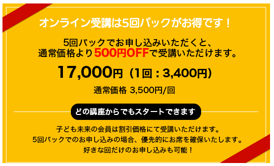 1回: 3,500円・ 5回セット:17,000円 ※500円OFF
