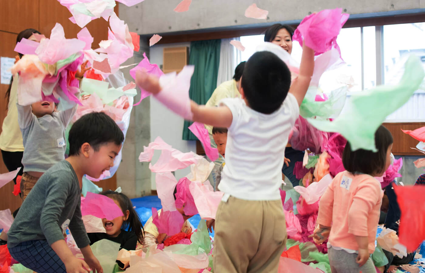 お母様やお父様と一緒に素材に触れ、自由表現を楽しみます。