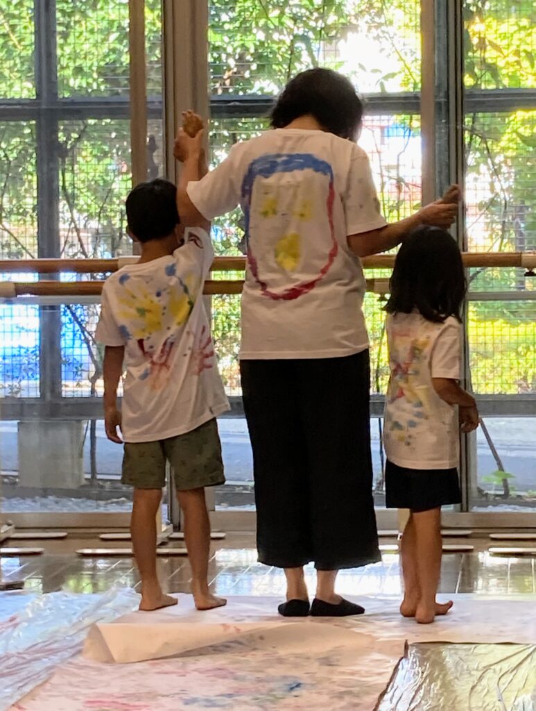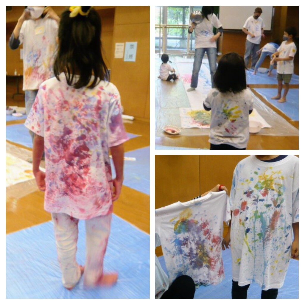 白いTシャツを着て、それぞれの体をキャンバスにして絵の具ワークをしました。